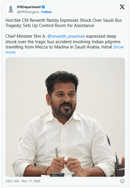 Chief Minister Revanth Reddy asked officials to collect full details of the passengers and confirm how many Telangana residents were on the bus. He also instructed officers to stay in touch with the Ministry of External Affairs and the Saudi Embassy.