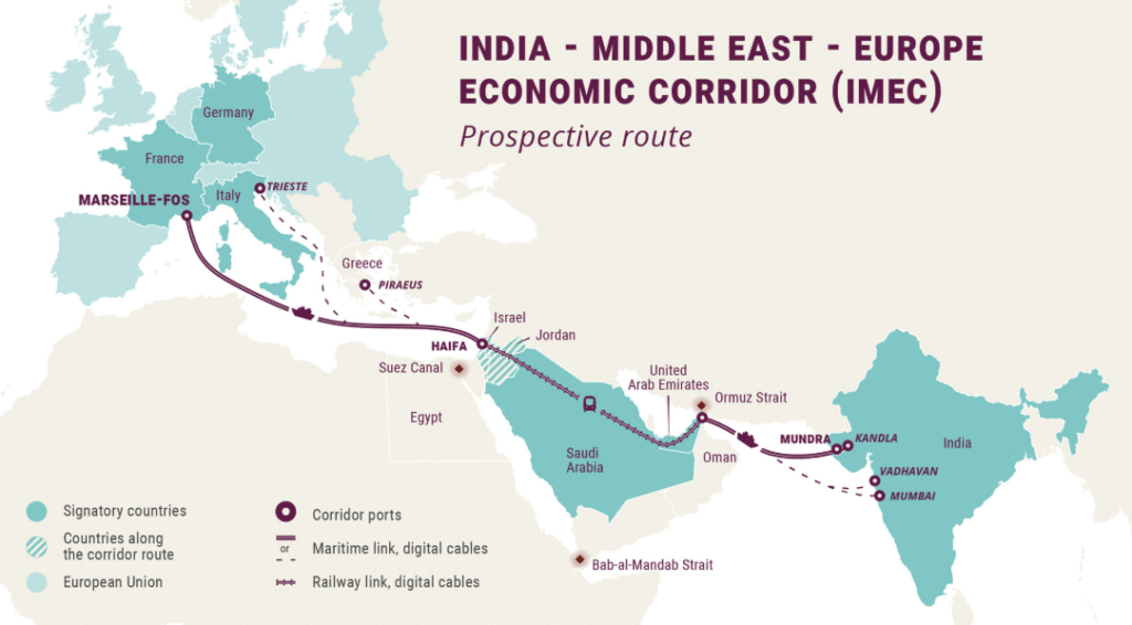 IMEC rests on a web of overlapping commitments rather than a single treaty. A 2023 memorandum of understanding, signed by India, the EU, the US, the UAE, Saudi Arabia, France, Germany, and Italy, anchors cooperation on infrastructure, clean energy, and digital connectivity.